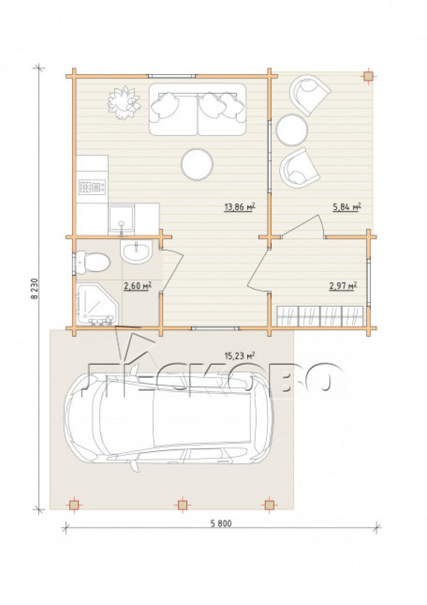 • Стеновой комплект: мини-брус камерной сушки 44мм×145 мм. с чашами под проект. Материал дерева — ель, сосна (ГОСТ 8486). Влажность 12-16%. Высота стен 2,16 м.;