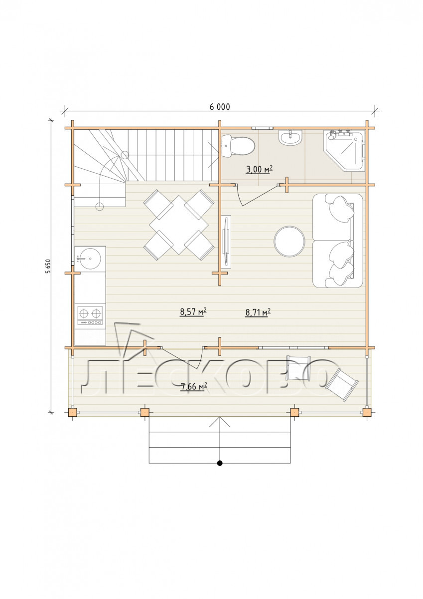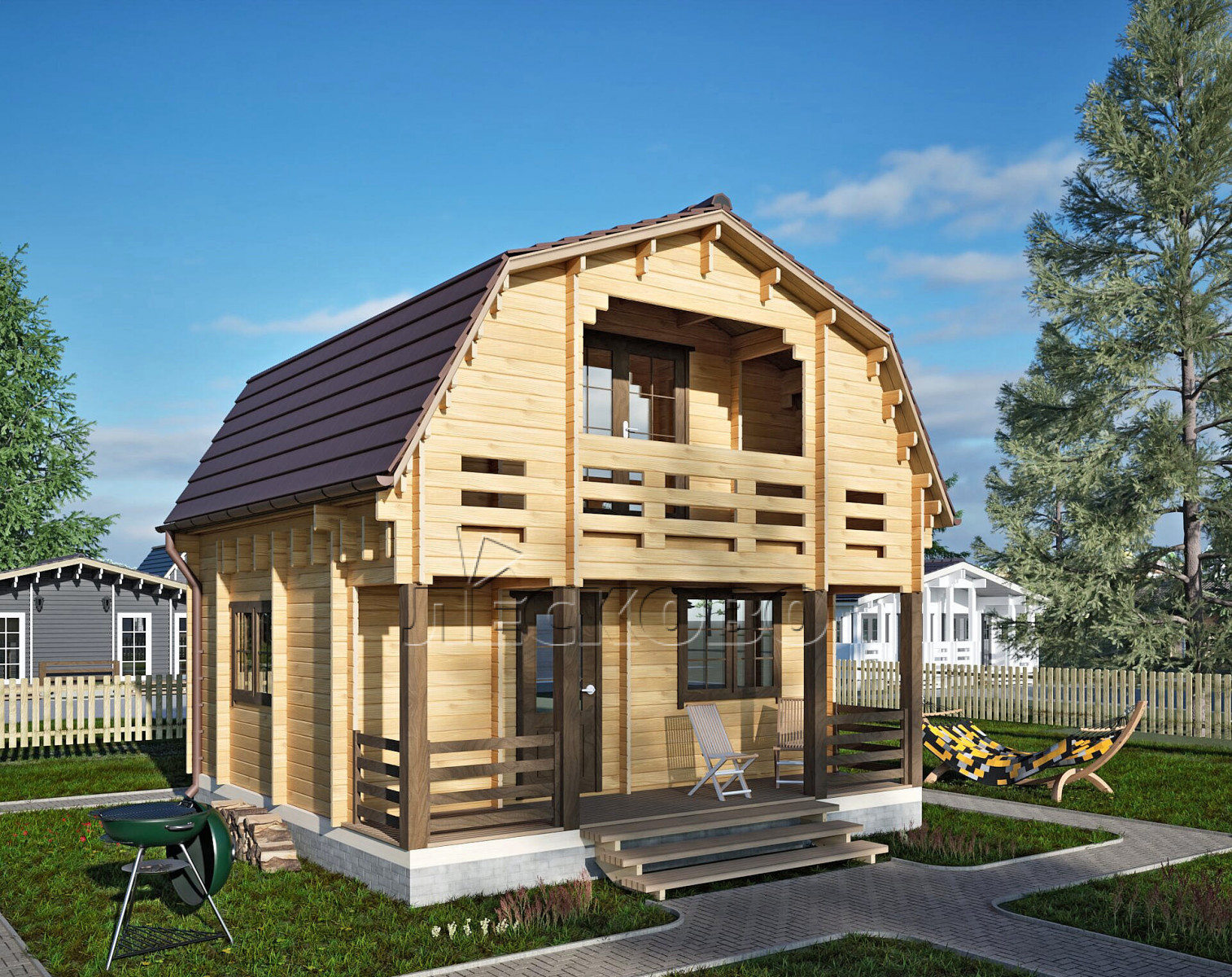 • Стеновой комплект: мини-брус камерной сушки 44мм×145 мм. с чашами под проект. Материал дерева — ель, сосна (ГОСТ 8486). Влажность 12-16%. Высота стен 2,16 м.;