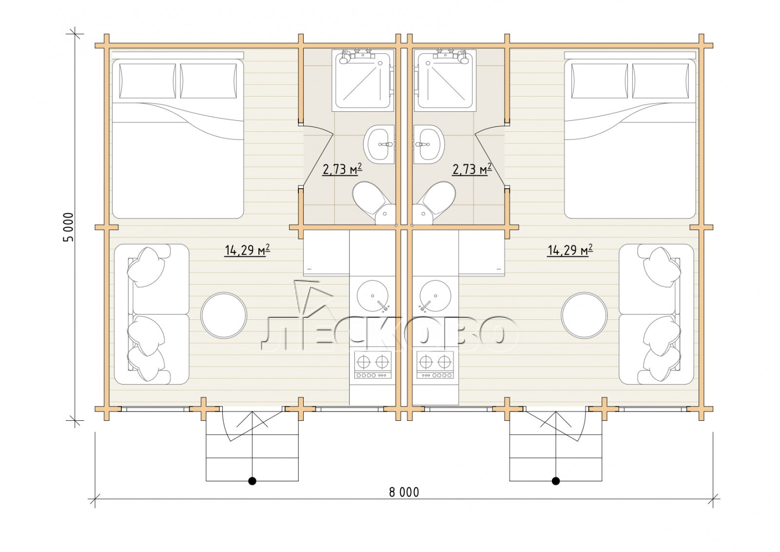 • Стеновой комплект: мини-брус камерной сушки 44мм×145 мм. с чашами под проект. Материал дерева — ель, сосна (ГОСТ 8486). Влажность 12-16%. Высота стен 2,16 м.;