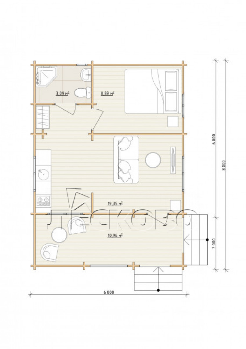 • Стеновой комплект: мини-брус камерной сушки 44мм×145 мм. с чашами под проект. Материал дерева — ель, сосна (ГОСТ 8486). Влажность 12-16%. Высота стен 2,16 м.;