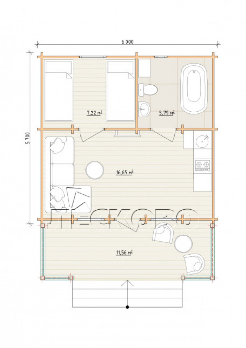 • Стеновой комплект: мини-брус камерной сушки 44мм×145 мм. с чашами под проект. Материал дерева — ель, сосна (ГОСТ 8486). Влажность 12-16%. Высота стен 2,16 м.;