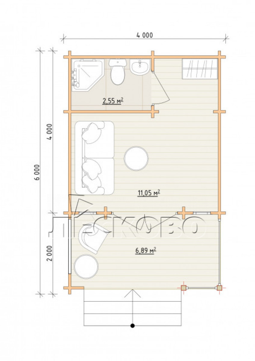 • Стеновой комплект: мини-брус камерной сушки 44мм×145 мм. с чашами под проект. Материал дерева — ель, сосна (ГОСТ 8486). Влажность 12-16%. Высота стен 2,16 м.;