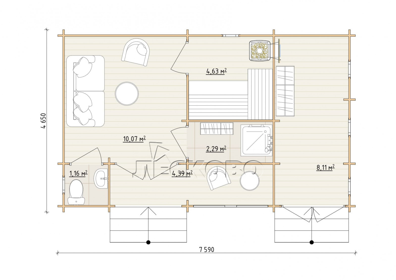 • Потолок: имитация бруса 20×135 мм., камерной сушки;