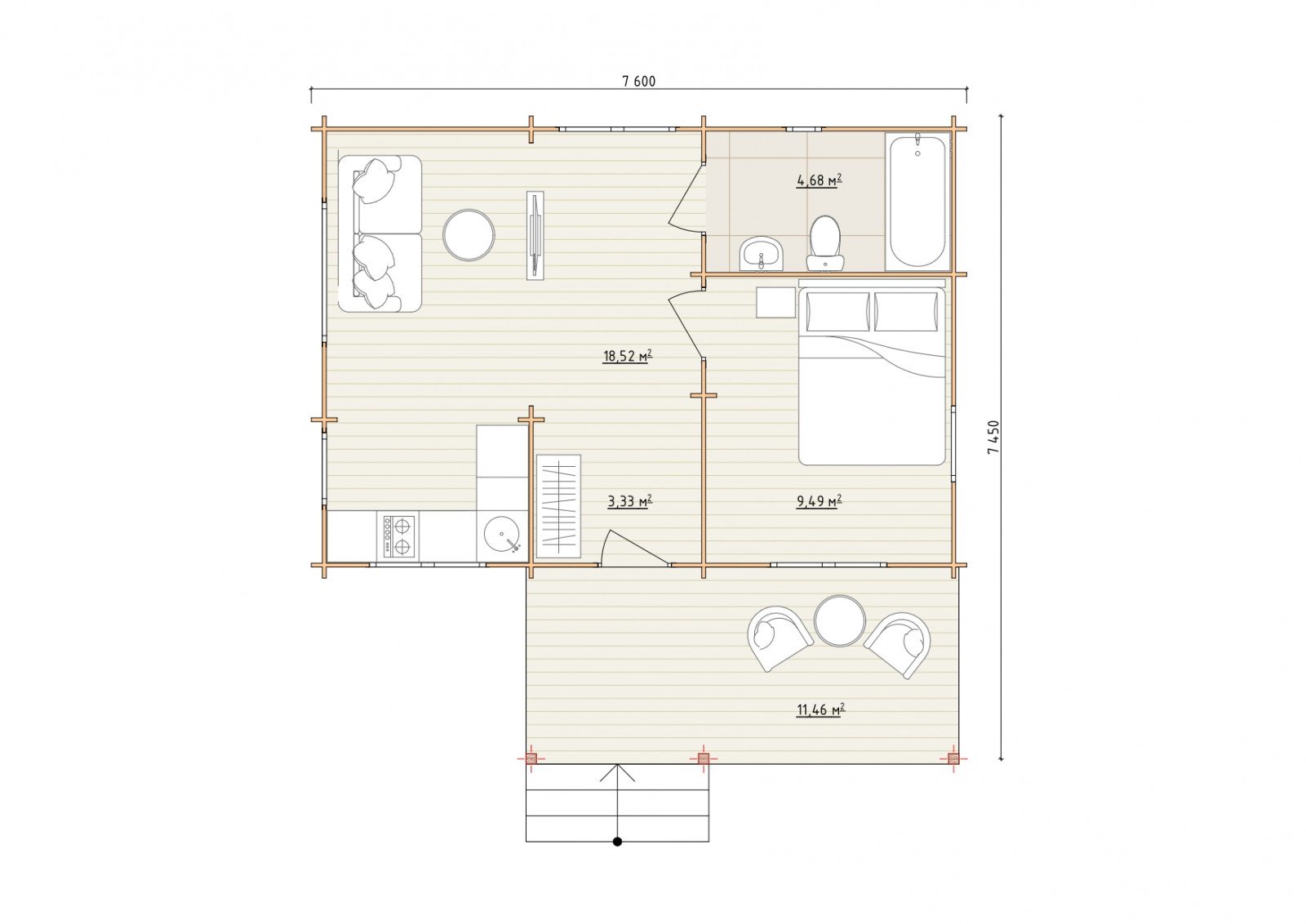 • Потолок: имитация бруса 20×135 мм., камерной сушки;