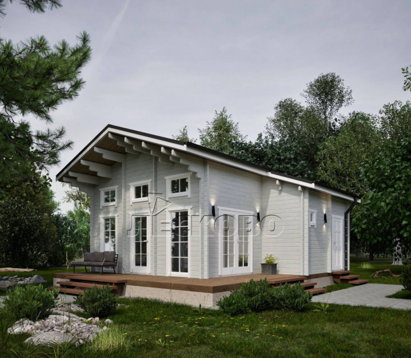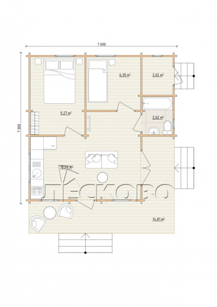 • Стеновой комплект: мини-брус камерной сушки 44мм×145 мм. с чашами под проект. Материал дерева — ель, сосна (ГОСТ 8486). Влажность 12-16%. Высота стен 2,16 м.;