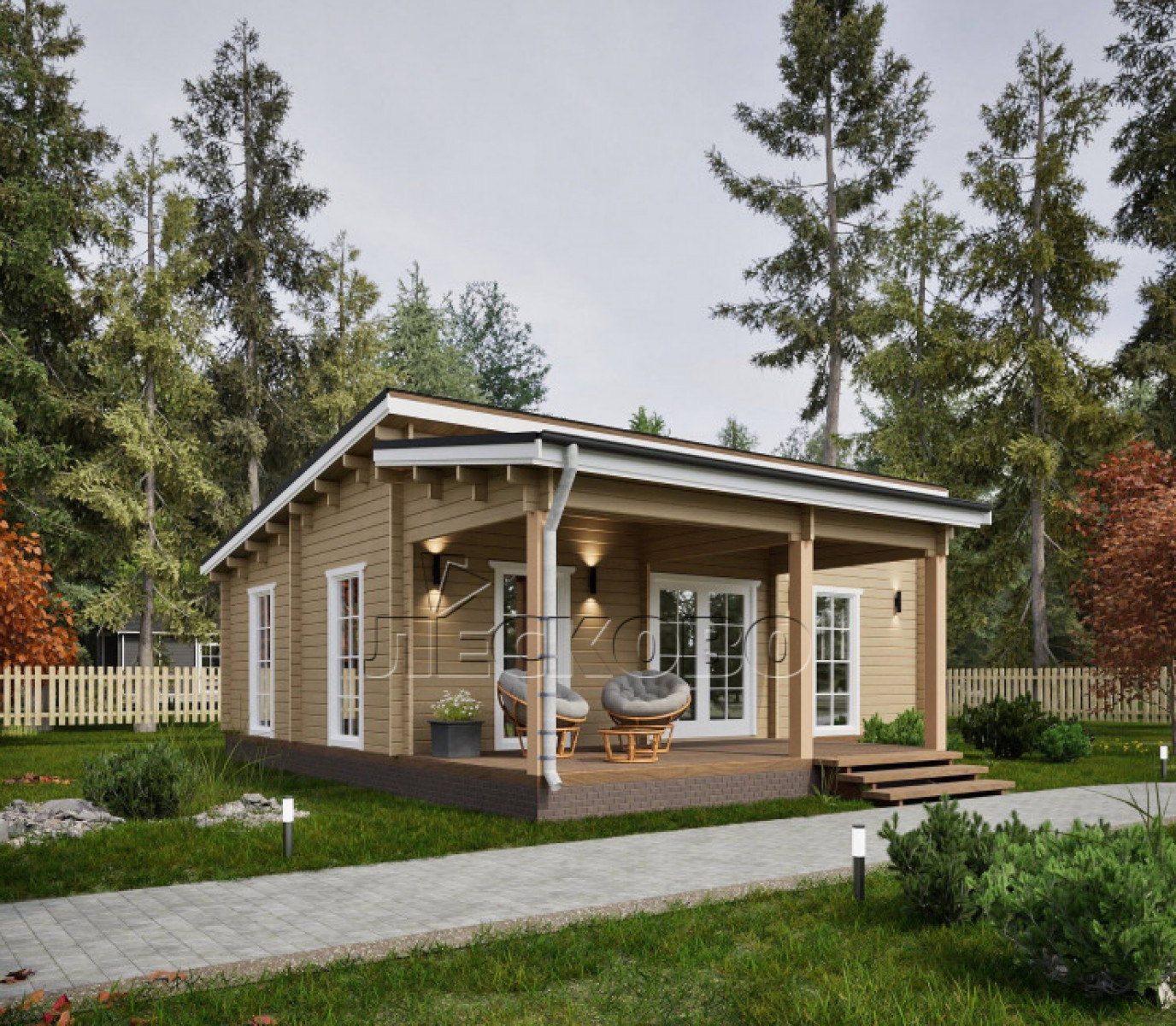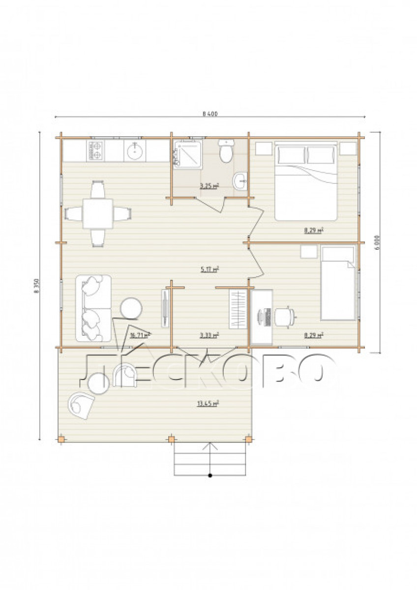 • Стеновой комплект: мини-брус камерной сушки 44мм×145 мм. с чашами под проект. Материал дерева — ель, сосна (ГОСТ 8486). Влажность 12-16%. Высота стен 2,16 м.;