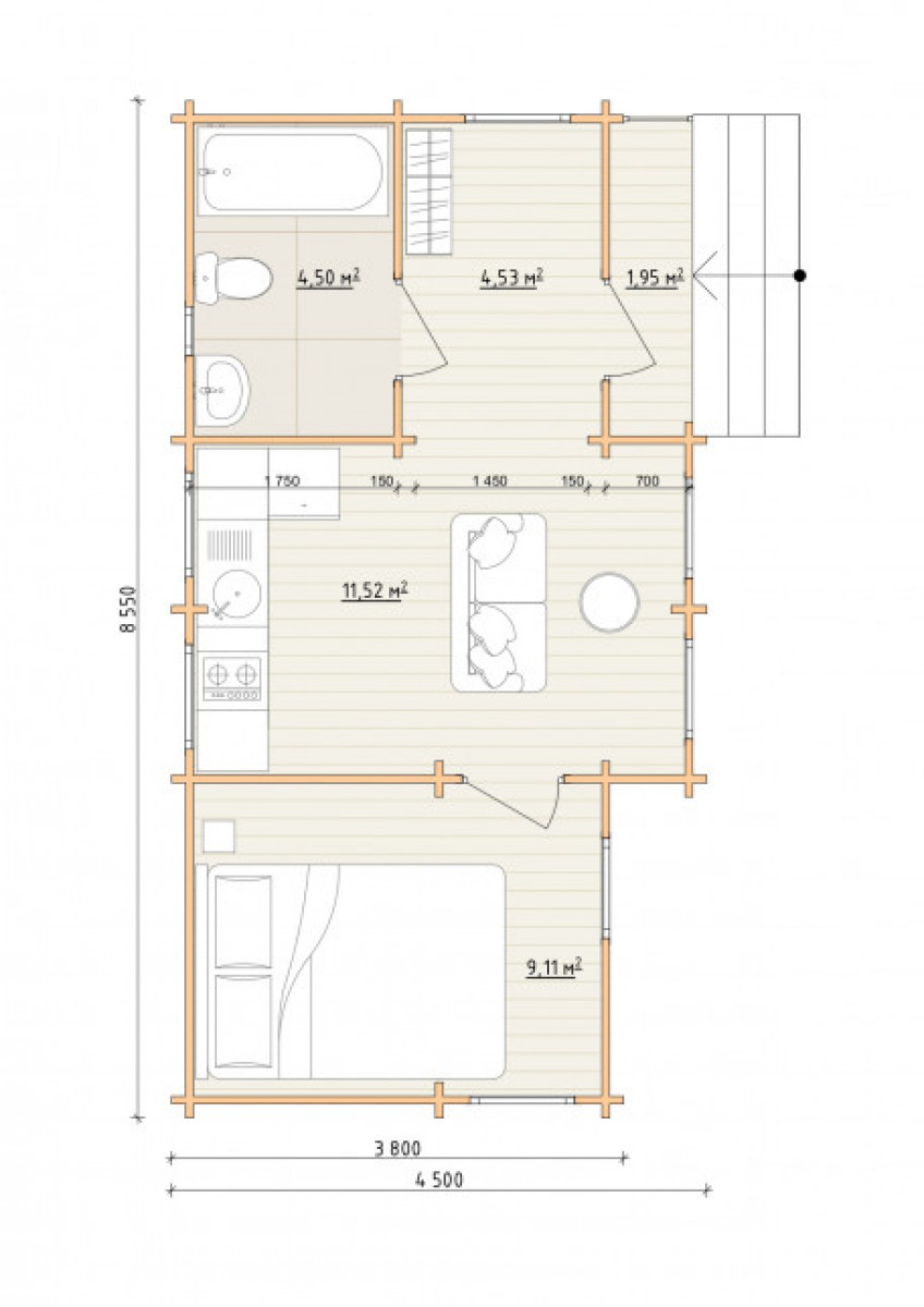 • Потолок: имитация бруса 20×135 мм., камерной сушки;
