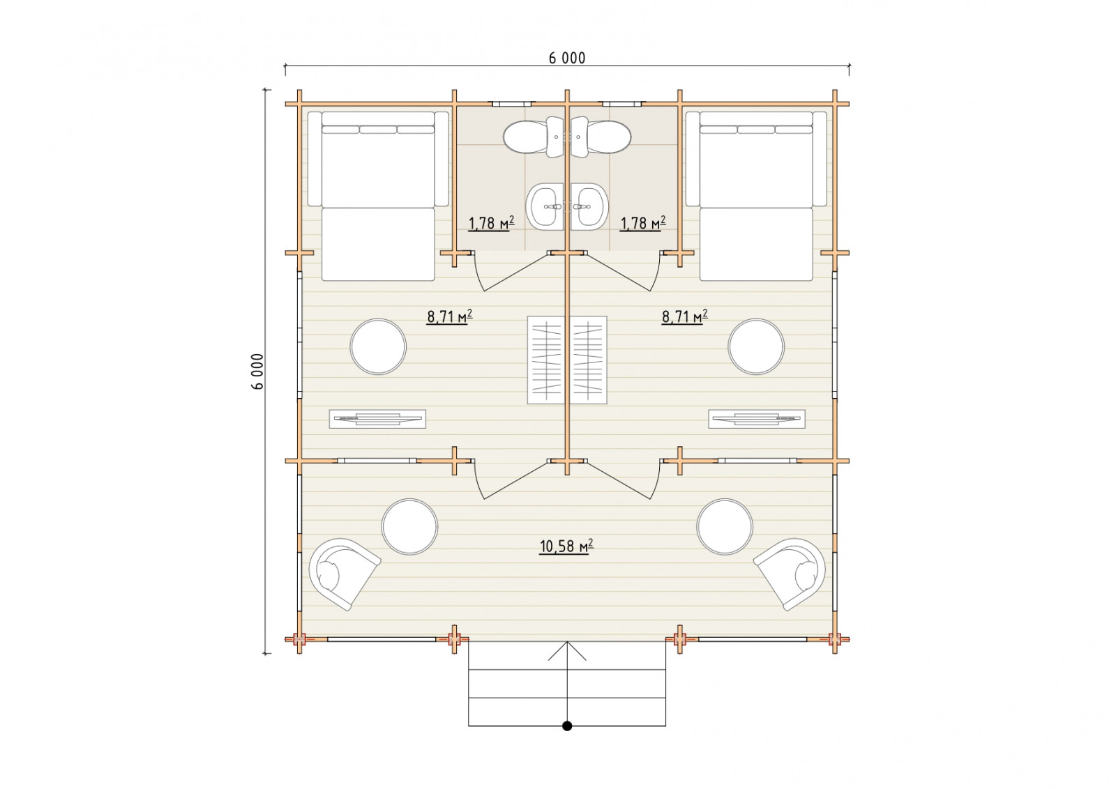 • Стеновой комплект: мини-брус камерной сушки 44мм×145 мм. с чашами под проект. Материал дерева — ель, сосна (ГОСТ 8486). Влажность 12-16%. Высота стен 2,16 м.;
