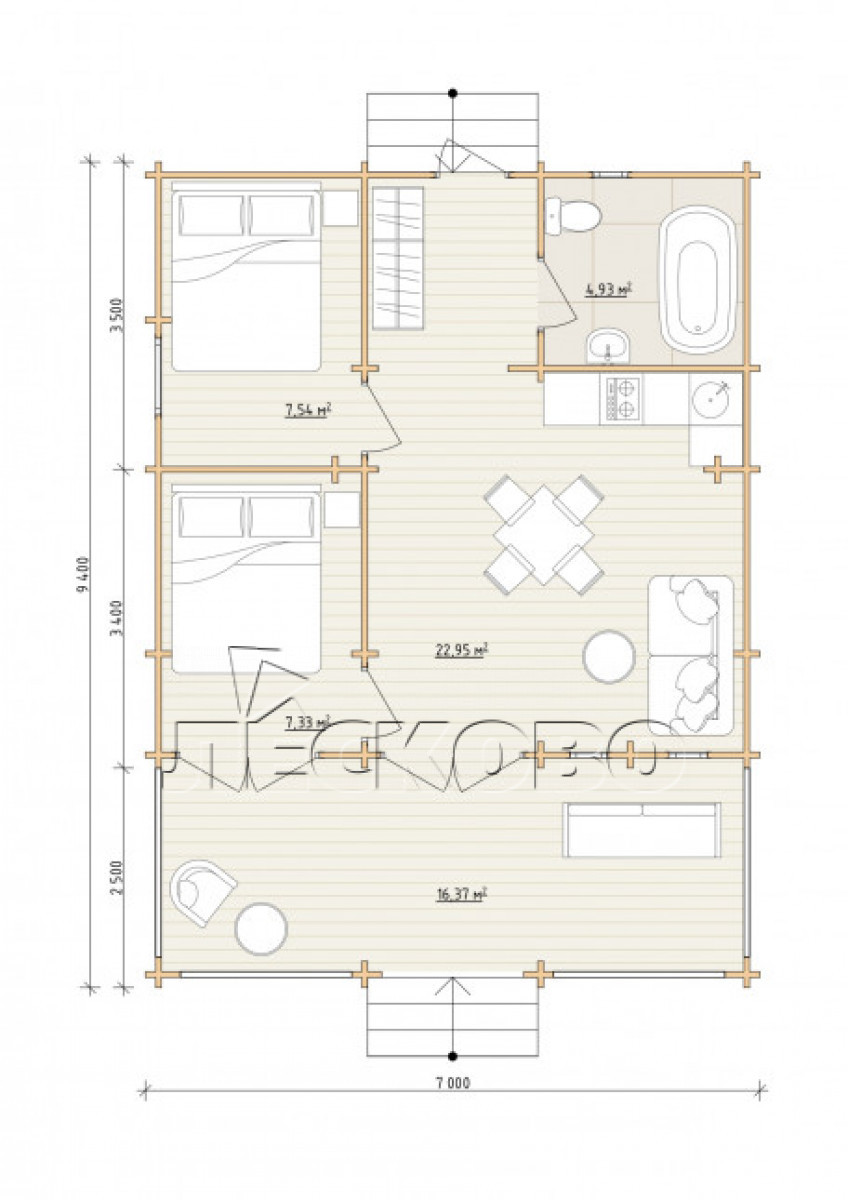• Стеновой комплект: мини-брус камерной сушки 44мм×145 мм. с чашами под проект. Материал дерева — ель, сосна (ГОСТ 8486). Влажность 12-16%. Высота стен 2,16 м.;