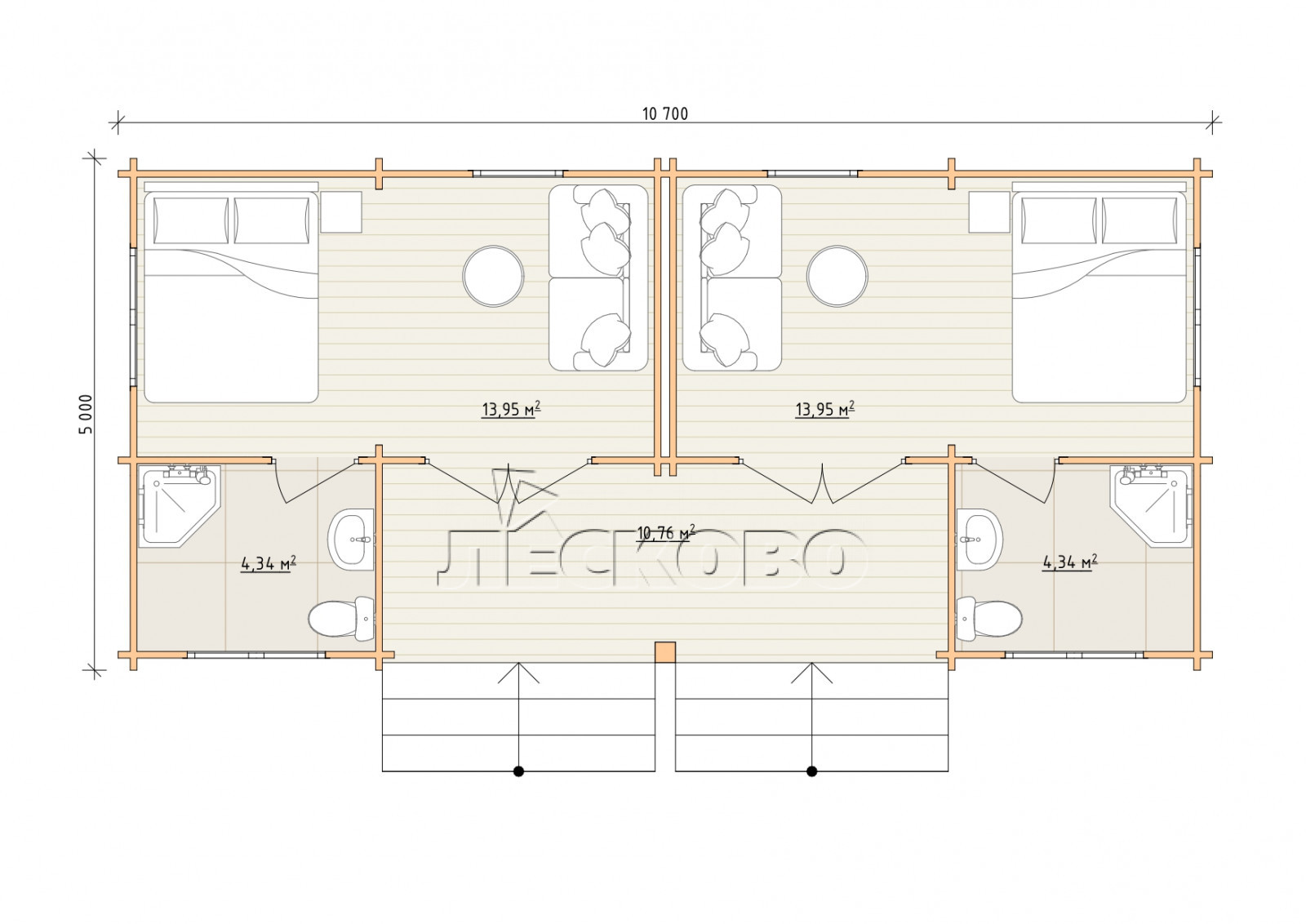 • Стеновой комплект: мини-брус камерной сушки 44мм×145 мм. с чашами под проект. Материал дерева — ель, сосна (ГОСТ 8486). Влажность 12-16%. Высота стен 2,16 м.;