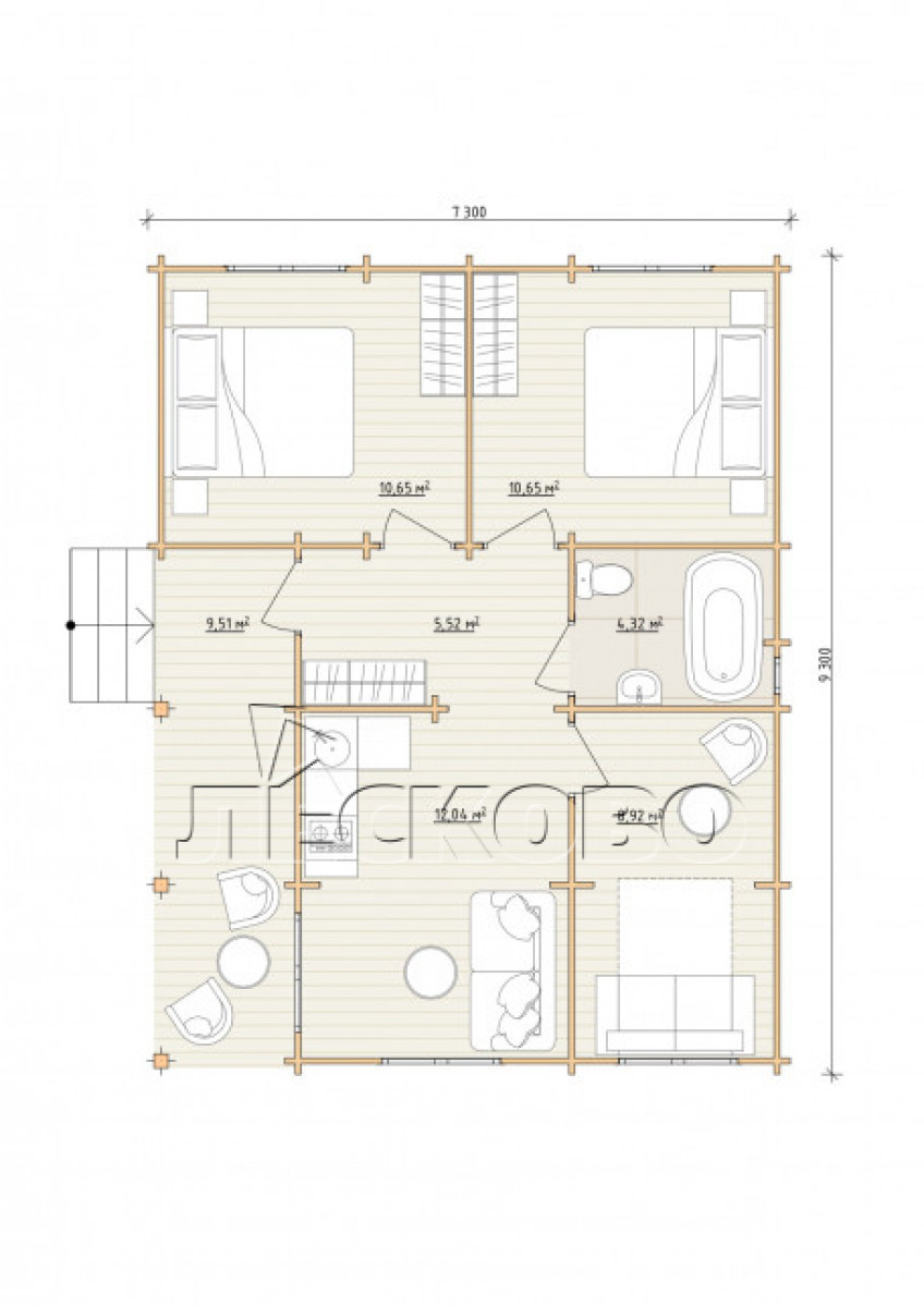 • Стеновой комплект: мини-брус камерной сушки 44мм×145 мм. с чашами под проект. Материал дерева — ель, сосна (ГОСТ 8486). Влажность 12-16%. Высота стен 2,16 м.;