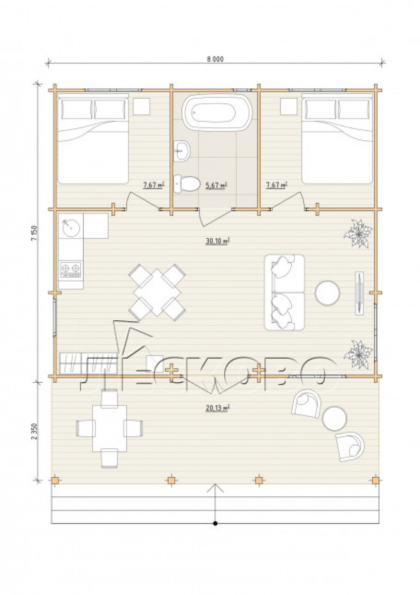 • Потолок: имитация бруса 20×135 мм., камерной сушки;
